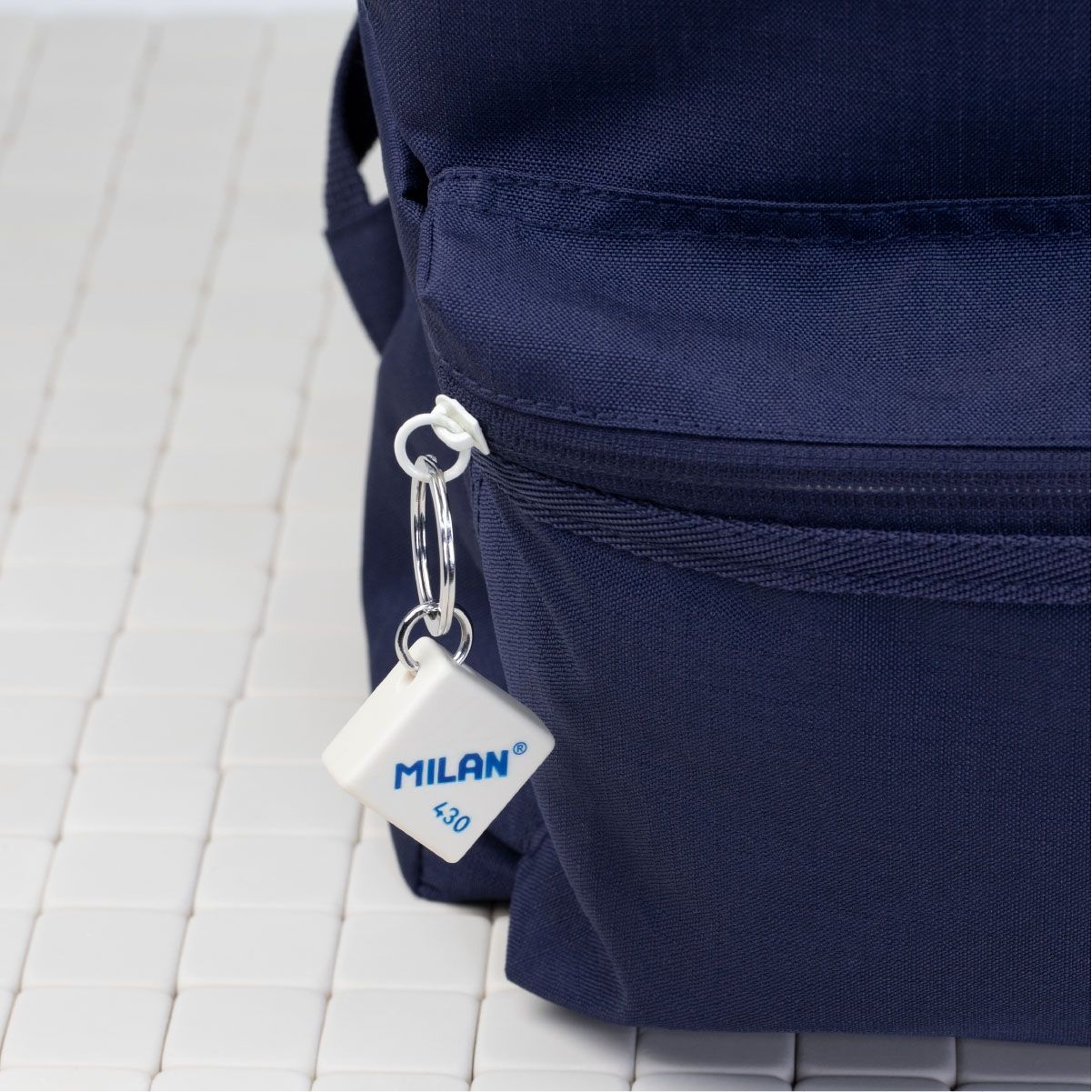 Rucsac urban clasic cu 2 fermoare, culoare bleumarin. Colecția 430 since 1918, inspirată de culorile și designul original al radierelor MILAN, fabricată în Spania din 1918. Compartiment principal cu husă de protecție pentru laptop. Buzunar frontal și două buzunare laterale cu acces rapid. Bretele reglabile, spate căptușit și respirabil. Buzunarul frontal include un breloc cu radiera 430 pe mânerul fermoarului. Căptușeală interioară bleumarin imprimată cu o grilă care evocă forma radierelor MILAN. Material exterior „Ripstop”: ușor și rezistent la rupturi și ruperi. Folosește o tehnică specială care țese fire groase de întărire la intervale regulate, creând un model încrucișat. Compoziția materialului: material exterior din poliester și căptușeală interioară.