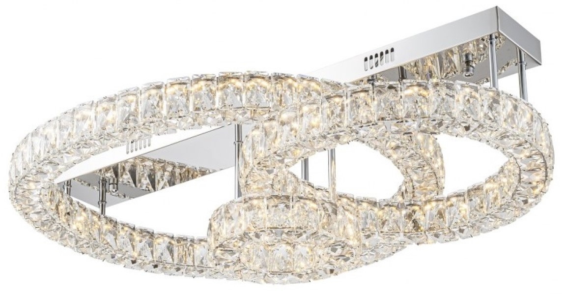 Plafonul LED de tavan îmbină designul avangardist cu luxul, datorită construcției sale formate din trei inele interconectate, decorate cu sticlă fațetată de înaltă calitate. Baza sa cromată amplifică strălucirea cristalului, creând un efect luminos spectaculos în orice încăpere. Tehnologia LED integrată asigură o iluminare eficientă și durabilă, fiind ideală pentru spații moderne, precum livinguri, săli de mese sau lobby-uri. Designul său dinamic și rafinat transformă acest plafon într-un punct de atracție al oricărui decor, adăugând o notă de eleganță și exclusivitate.