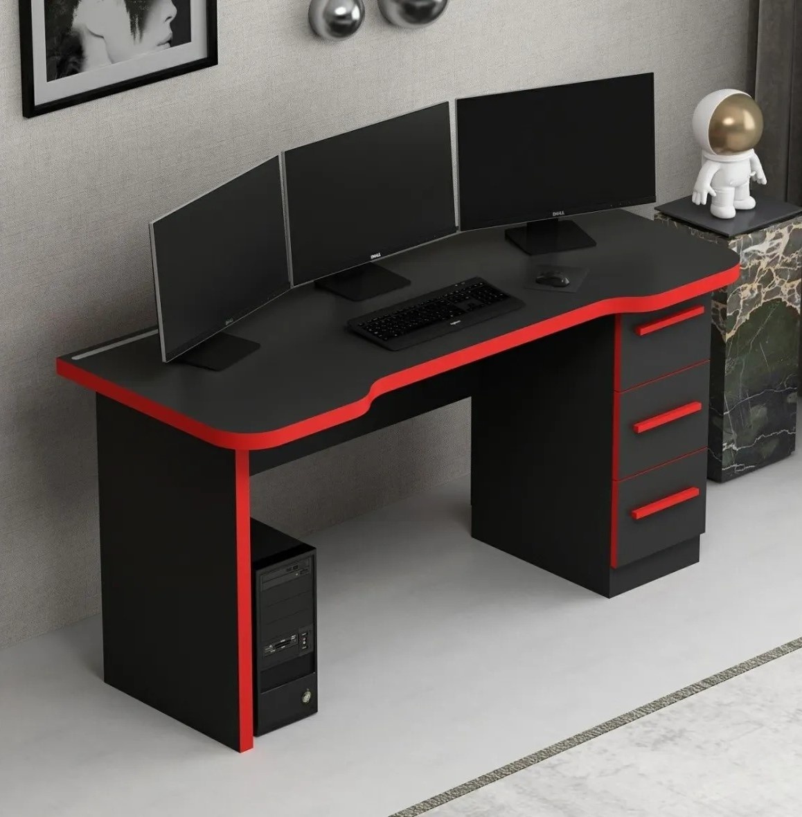 Suprafața generoasă permite așezarea monitorului, tastaturii, mouse-ului și tuturor accesoriilor esențiale, menținând ordinea și eliberând spațiul de lucru. Un spațiu bine organizat contribuie la o atmosferă calmă și la o experiență de joc mai relaxată.