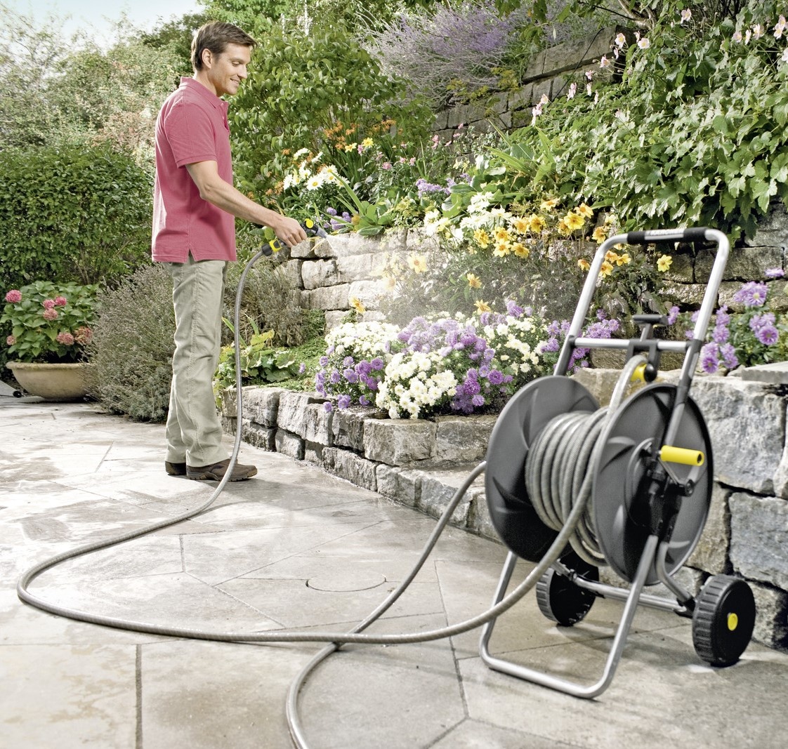Металлическая тележка для шланга HT 80 M, в комплекте С 20-метровым шлангом 1/2" PrimoFlex® «Plus» 2.645-144.0, пистолетом «Plus» 2.645-048.0, 4 универсальными коннекторами «Plus» (3 × 2.645-193.0, 1 × 2.645-194.0) и штуцером для присоединения к крану G3/4.