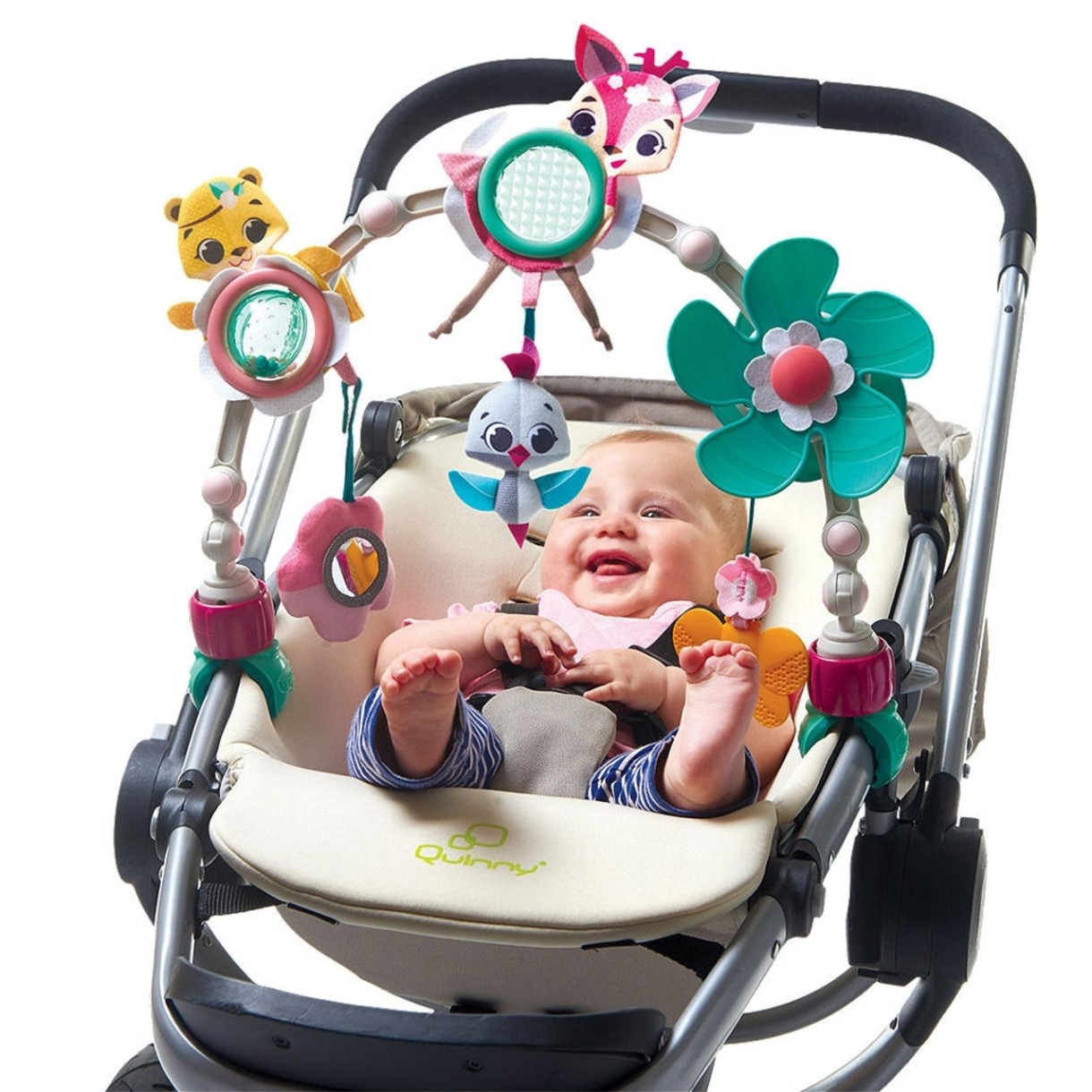 - Prevazuta cu: oglinda usor de prins de manutele copilului, minge zornaitoare amuzanta, jucarie muzicala sub forma de pasare ce poate fi activata de micut, prisma transparenta sub forma de soare, elice activata de copil, inel gingival usor de prins.