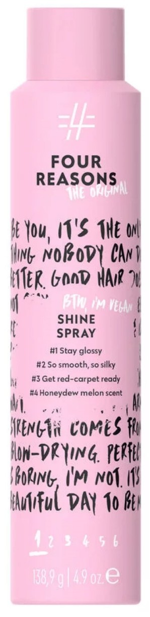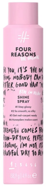 Shine Spray Four Reasons Original este un spray uscat pentru strălucire, care conferă părului luciu sclipitor și finețe, fără a-l îndrepta. Spray-ul cu particule fine oferă oricărei coafuri un luciu frumos și natural.