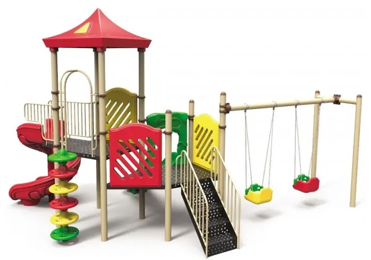 Include: Scăra cu balustrade, Turn cu acoperiș, Turn fara acoperis, Balcon triunghiula, Tobogan (Н=1m), Tobogan spiral (Н=1,5m), Podul de observație, Scara de catarare, Structura Metalica pentru Leagan, doua Legane pe lanțuri.