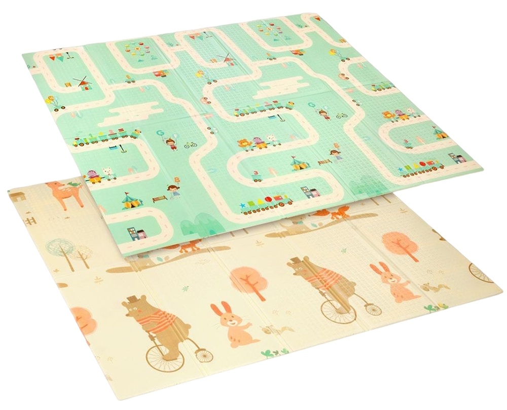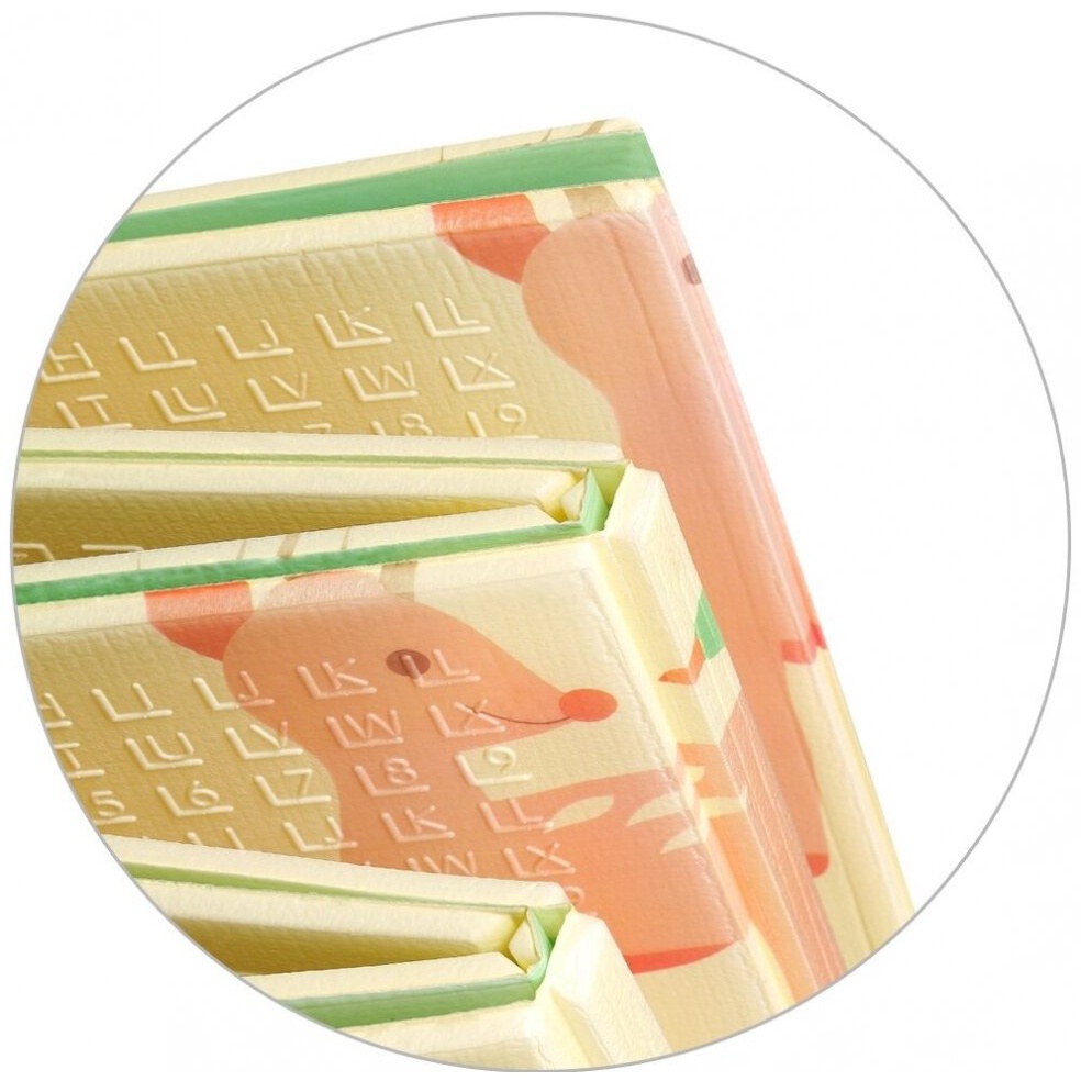 Salteaua pliabilă față-verso are modele și texturi colorate și variate care ajută la dezvoltarea vederii și a simțului tactil. Conține imagini cu animale, litere, numere și forme care promovează dezvoltarea mentală și motorie a copiilor.