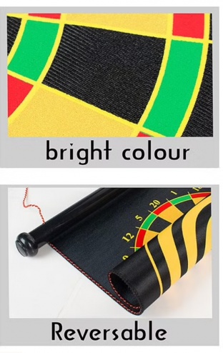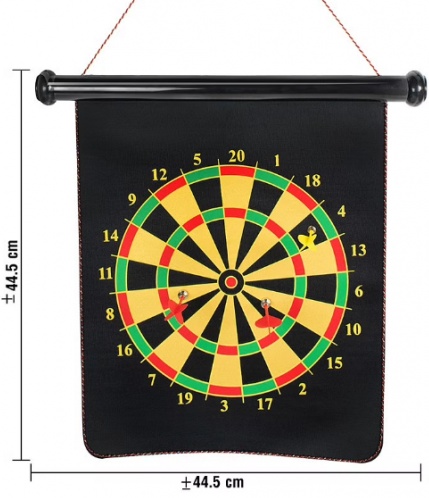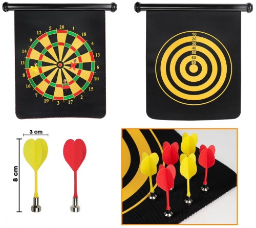 Placa de săgeți tradițională pe o parte și un joc cu ochi de tauri pe cealaltă parte. Vine cu șase săgeți magnetice cu vârf plat roșu și galben. Săgețile cu vârf plat fac acest joc sigur.