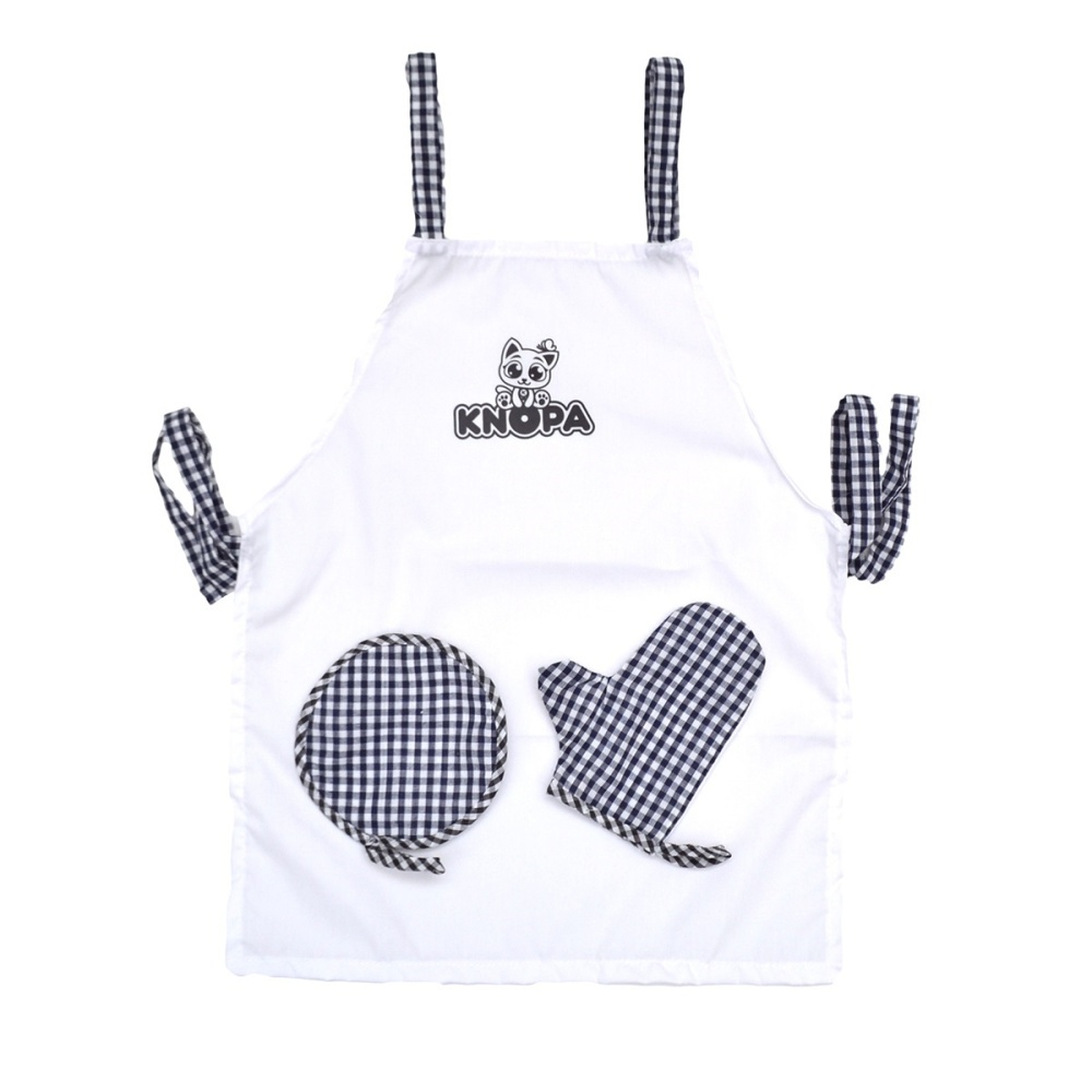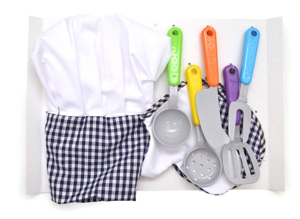 Setul include cele mai esențiale atribute ale unui bucătar - o pălărie, un șorț, un suport pentru oale și ustensile de bucătărie.