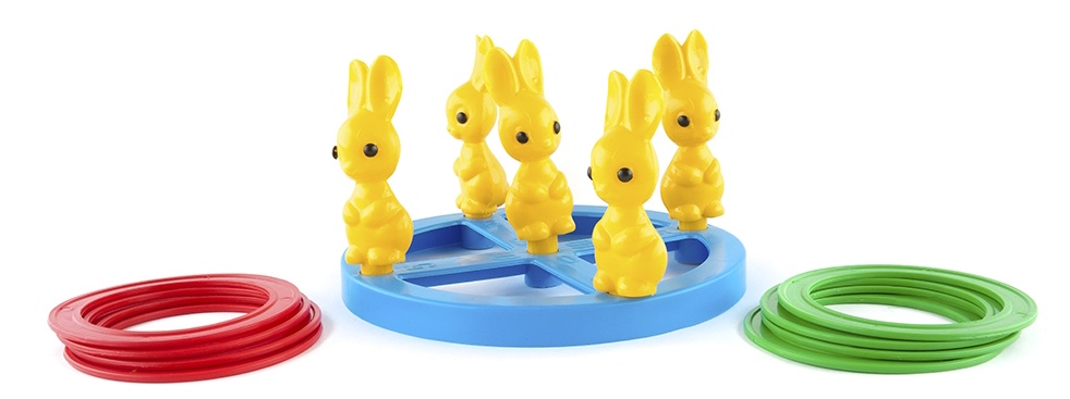 Aruncarea inelelor este un joc clasic pentru antrenarea preciziei și dexterității. Este simplu, dar în același timp atât de captivant încât întreaga familie îl poate juca. Figurinele de iepurași fac jocul și mai atractiv.