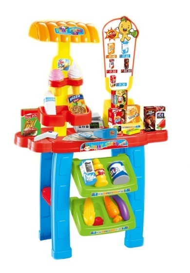 Acest set de jucărie are un tejghea cu rafturi pentru depozitarea cumpărăturilor și un cărucior de cumpărături. O mulțime de accesorii: 28 de accesorii și autocolante colorate pentru o experiență completă de cumpărături la supermarket. Setul include multe accesorii, cum ar fi înghețată, dulciuri, alimente, etc.