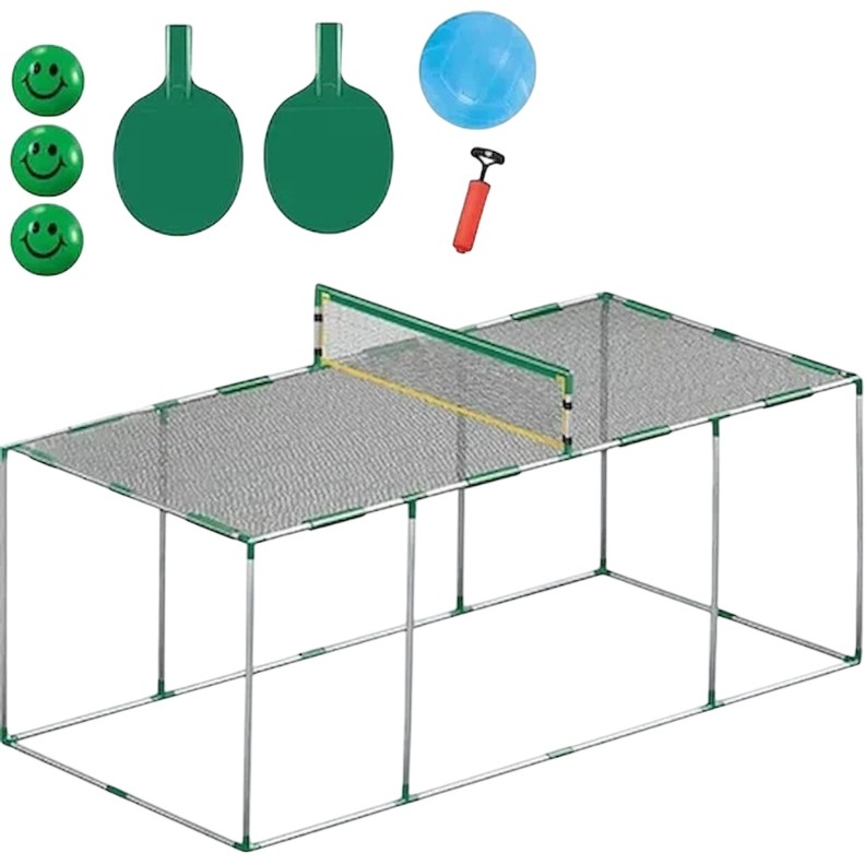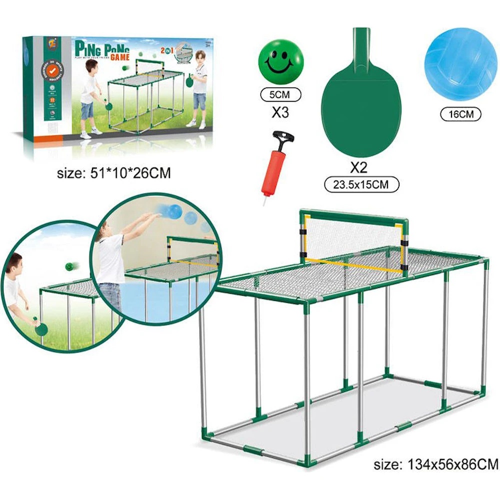 Setul de joc pentru copii 2 în 1 combină tenisul de masă (ping-pong) și voleiul. Structura este o plasă pliabilă, care poate fi folosită atât pentru joc cu palete, cât și pentru pasarea mingii cu mâinile.