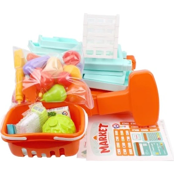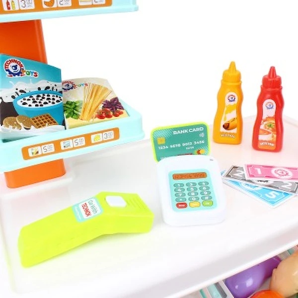 Un element special al setului este terminalul bancar pentru plăți cu cardul (inclus) și un scanner de coduri care simulează procesul de plată: emite un semnal sonor și luminează. Micii vânzători pot „scana” cumpărăturile și accepta plăți „fără numerar”, simțindu-se ca adevărați casieri. Setul include, de asemenea, bani de jucărie și autocolante decorative pentru a face fiecare vânzare mai realistă. Jocul îi ajută pe copii să învețe bazele schimbului și ale numărării, implicând în același timp prietenii și familia.