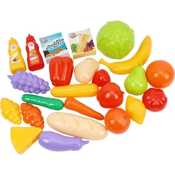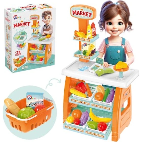Setul include un coș de cumpărături frumos și spațios, precum și o tejghea cu rafturi pentru organizarea diferitelor produse de jucărie: croissante, pâine, brânză, varză, cartofi, porumb, castravete, roșie, morcov, ardei, vânătă, ceapă, pară, măr, banană, struguri, lămâie, portocală și căpșuni. Standul include chiar și o vitrină pentru prăjituri cu cele mai tentante deserturi, precum și rafturi superioare pentru produse speciale. În plus, setul conține două cutii de carton pentru spaghete și cereale și două sticle pentru ketchup și muștar.