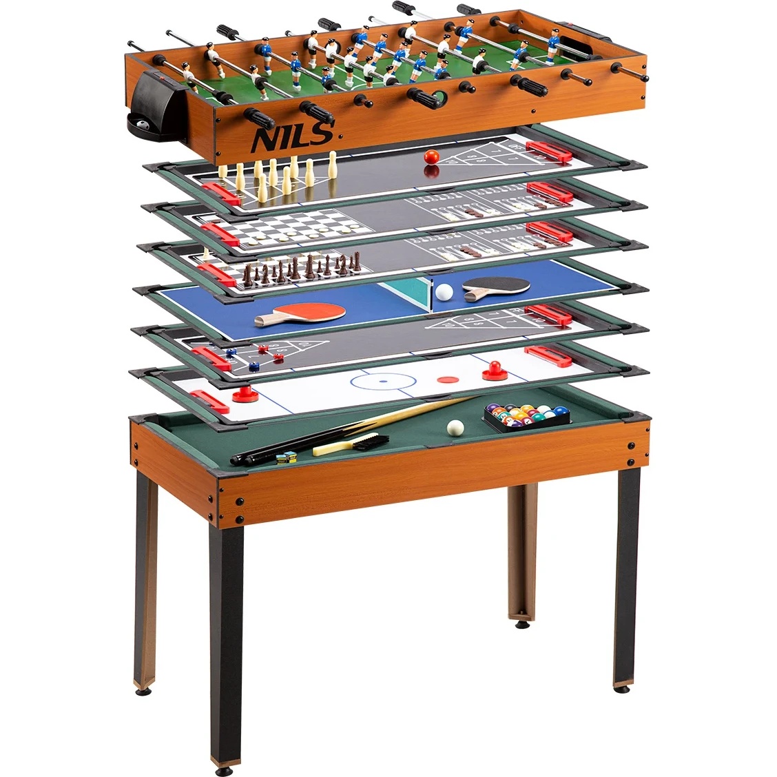 Masa de joc SDM 13-în-1 este un dispozitiv de divertisment multifuncțional. Permite desfășurarea a până la 13 jocuri diferite, fără a ocupa mult spațiu. Tablele de joc și toate accesoriile se pliază una peste alta, astfel încât totul să fie organizat într-un singur loc, iar masa să ocupe atât spațiu cât un fotbal de masă obișnuit.