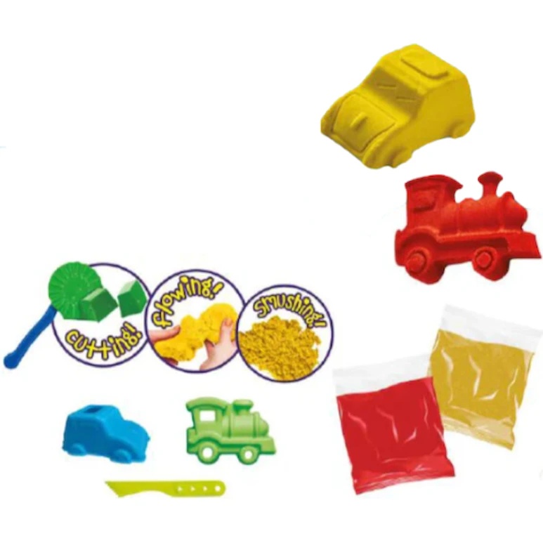 Acest set este ideal pentru jocuri creative și include nisip de culoare roșie, galbenă și verde pentru crearea trenurilor, mașinilor și a altor mijloace de transport distractive.