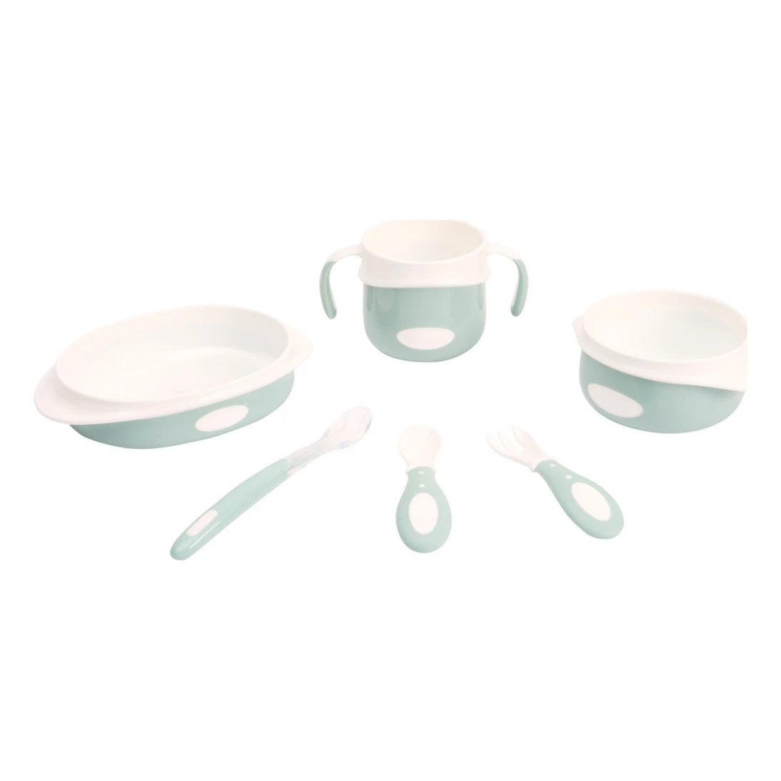 Setul include și o linguriță cu un capăt din silicon moale și un mâner lung, ergonomic. Perfect adaptată pentru mâna unui adult, va permite părinților să hrănească ușor bebelușul cu primele mese. Pentru o curățare ușoară, întregul set este compatibil cu mașina de spălat vase.