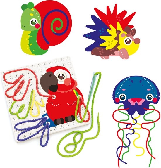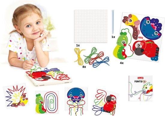 Intra in set1 placă Fantafilo, 1 ac de plastic, 8 șireturi, 4 forme de animale din carton, instructiuni si modele pentru copiere