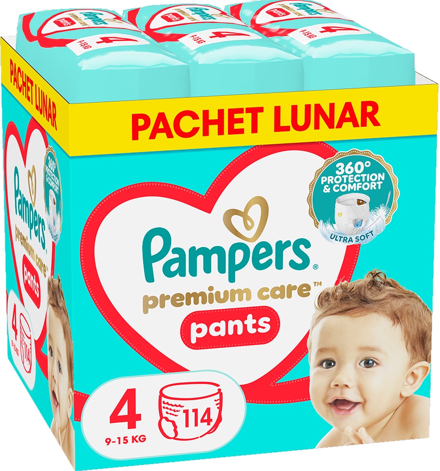 Scutecele‑chilotei Pampers Premium Care Pants nr. 4 (9‑15 kg), 114 buc. sunt concepute pentru copiii activi cu greutatea între 9 și 15 kg, oferind protecție completă și confort pe tot parcursul zilei. Datorită designului 360° Comfort Fit, materialele ultra moi și elastice se mulează pe forma corpului copilului pentru o potrivire perfectă și protecție împotriva scurgerilor, inclusiv lateral. Nucleul superabsorbant menține pielea uscată până la 12 ore, iar mansetele moi duble pentru zona piciorușelor oferă siguranță suplimentară. Scutecele sunt ușor de pus printr‑o singură mișcare, se pot scoate simplu prin ruperea lateralelor și se rulează cu bandă adezivă pentru eliminare facilă. Testate dermatologic și aprobate pentru pielea delicată a bebelușului, aceste scutece sunt o alegere confortabilă și practică pentru utilizare zilnică.