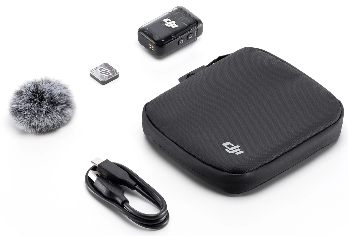 Set completTransmițător DJI Mic, clip magnetic, cutie de depozitare, cablu USB-A la USB-C, protectie impotriva vantului