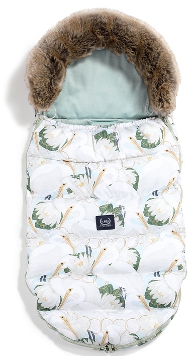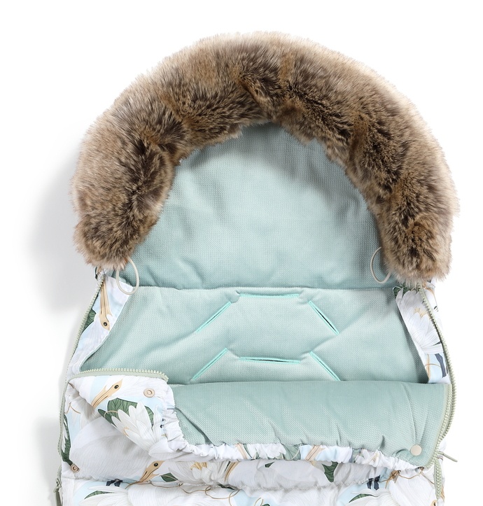 Căciula este o glugă caldă finisată cu o blană artificială elegantă, care poate fi detașată opțional Hota are benzi elastice cusute care vă permit să-i ajustați dimensiunea Umplere antialergică pufoasă în stratul superior 400 g Partea de jos a sacului căruciorului este căptușită cu un ortalion mat, impermeabil la interior, pentru a preveni murdărirea pantofilor.