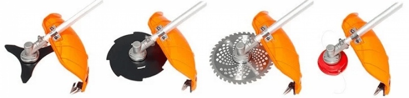 Altelecuțit cu lamă, două lame de ferăstrău, curea de umăr, set de chei, recipient pentru amestecarea benzinei cu ulei, bobina cu fir