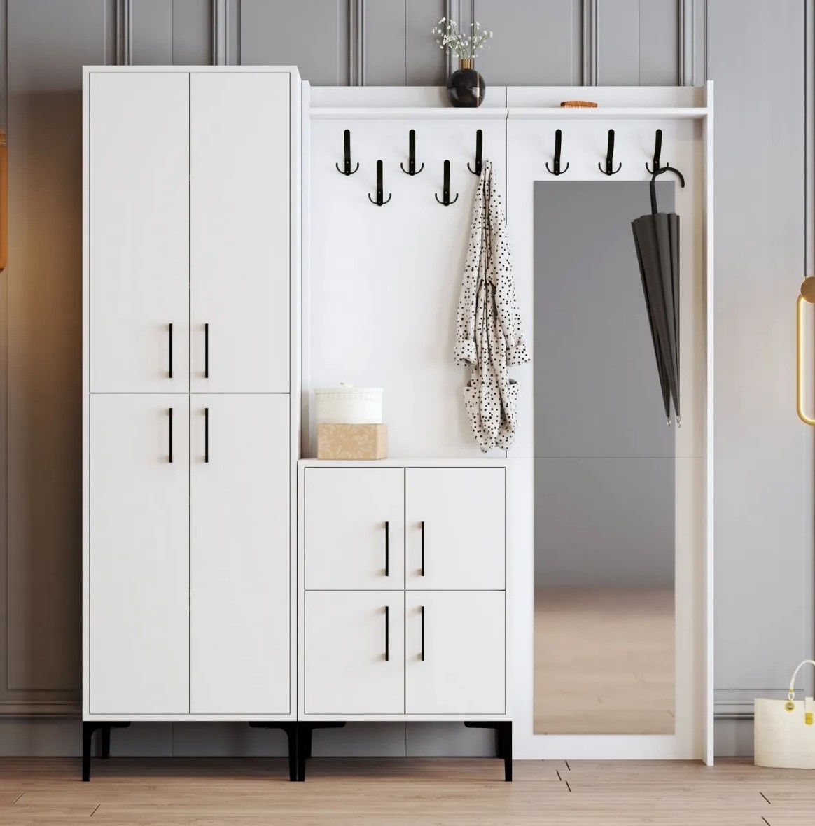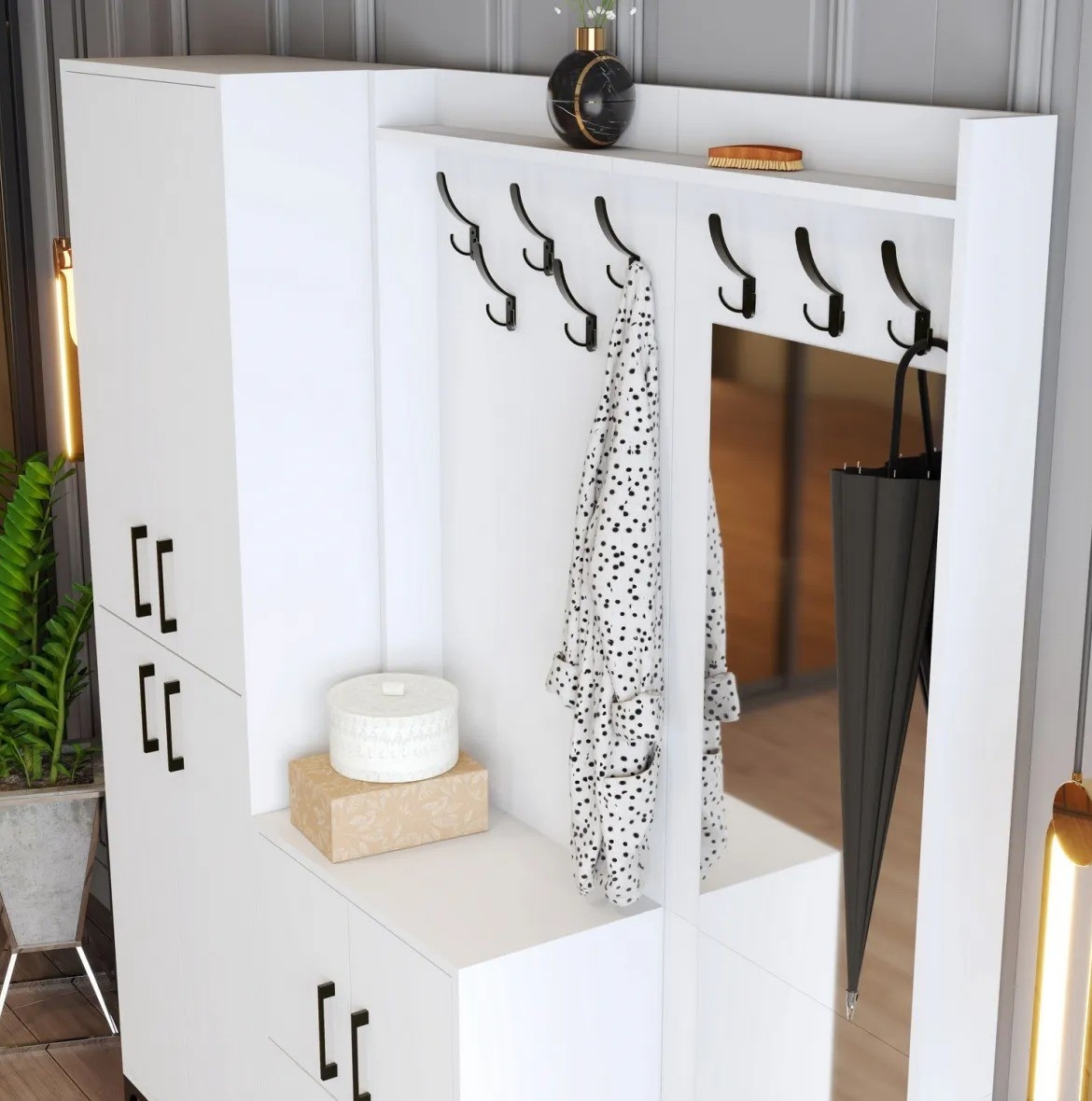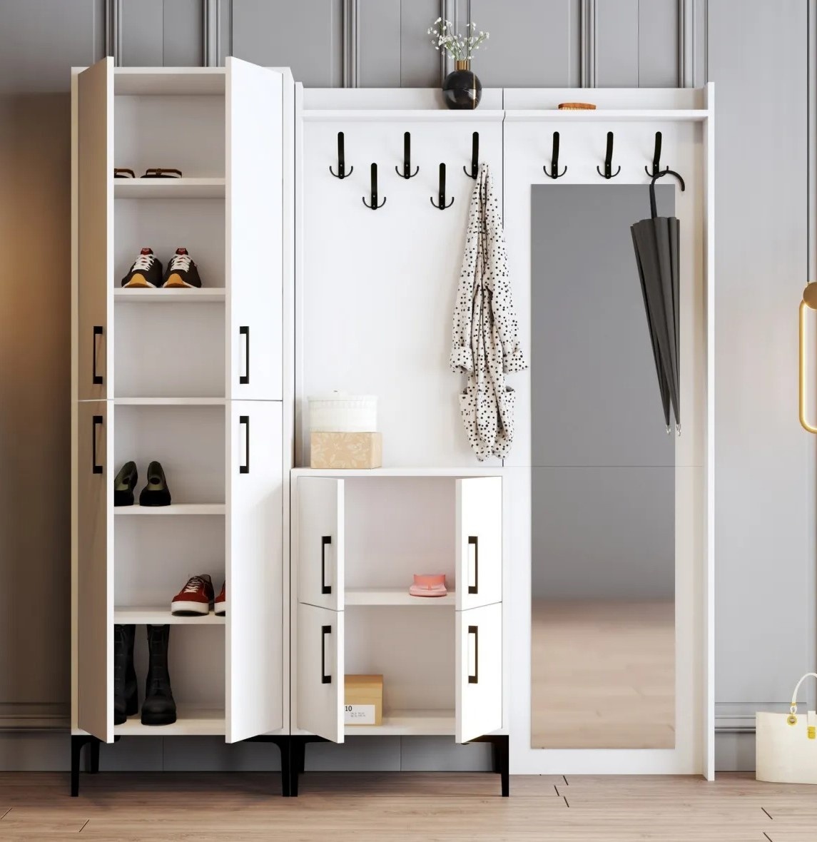 Acest suport de hol nu doar oferă depozitare eficientă, ci poate fi și fixat pe perete pentru un plus de stabilitate și siguranță. Această caracteristică garantează menținerea poziției corecte chiar și în zone cu trafic intens.