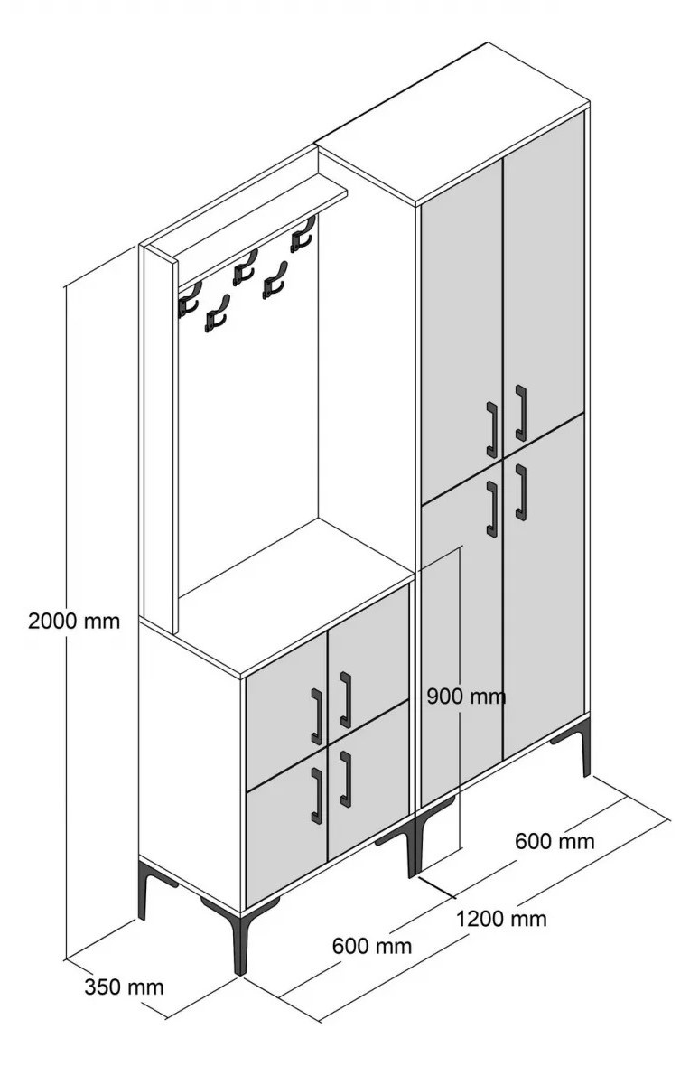 Având 120 cm lățime, 200 cm înălțime și 35 cm adâncime, suportul pentru hol este conceput pentru a se potrivi perfect în orice intrare. Dimensiunile sale compacte nu ocupă mult spațiu, oferind totuși numeroase opțiuni de depozitare. De asemenea, poate fi fixat pe perete pentru stabilitate și siguranță suplimentară.