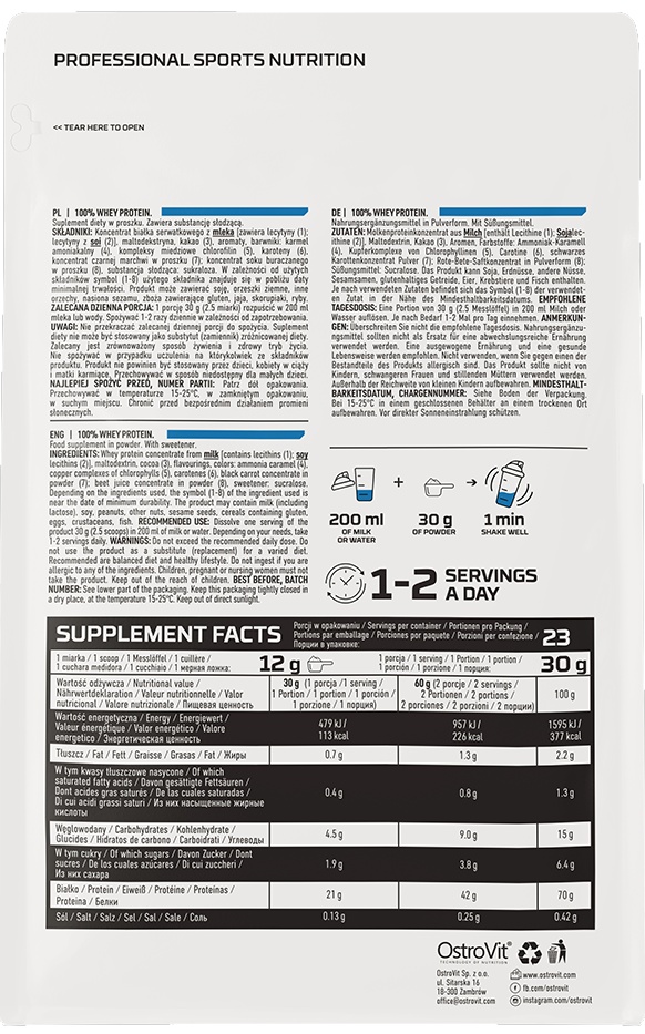 OstroVit 100% WHEY PROTEIN este un supliment proteic de înaltă calitate, conținând 70% proteine. Acest supliment alimentar este potrivit pentru toți sportivii, indiferent de disciplina practicată. Este recomandat în special în perioadele de creștere a masei musculare și de reducere a țesutului adipos. Poate fi folosit atât în timpul antrenamentelor avansate, cât și ca ingredient în alimentația zilnică pentru a crește valoarea nutrițională a dietei.