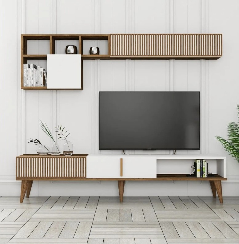 Unitatea este prevăzută cu mai multe rafturi, oferind spațiu suficient pentru dispozitive media, discuri și alte obiecte esențiale. Raftul de perete completează ansamblul și permite expunerea obiectelor decorative.