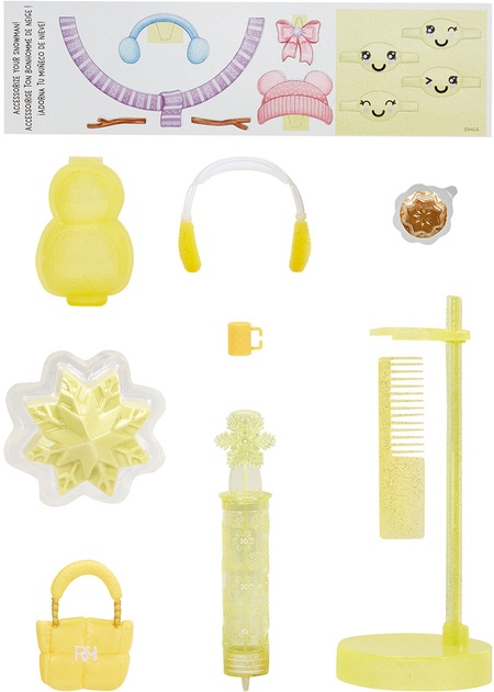 Complectatieseringă, ochelari de soare, geantă de mână, cană, mucegai pentru om de zăpadă, card de om de zăpadă, nisip cinetic, pieptene, suport pentru păpuși, pachet de pudră cu sclipici, instrucțiuni