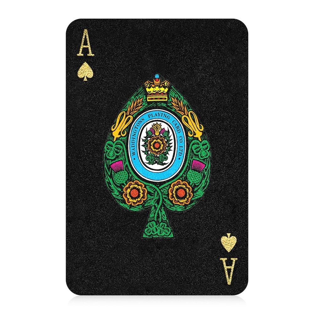 Adaugă rafinament și stil jocurilor tale preferate cu acest set uimitor de cărți de joc Waddingtons No. 1, în culorile elegante negru și auriu. Spatele fiecărei cărți este decorat cu un model sofisticat din folie aurie, iar semnele clasice ale cărților sunt reinterpretate: pică și trefla strălucesc în auriu, în timp ce inima roșie și caro ies în evidență cu un design roșu pe fundal negru.