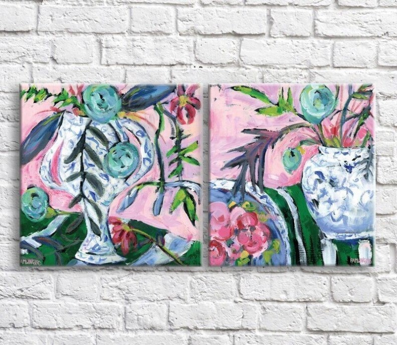 Pictură ArtPoster Vase with flowers on a Pink background, still life, diptych (3467702)