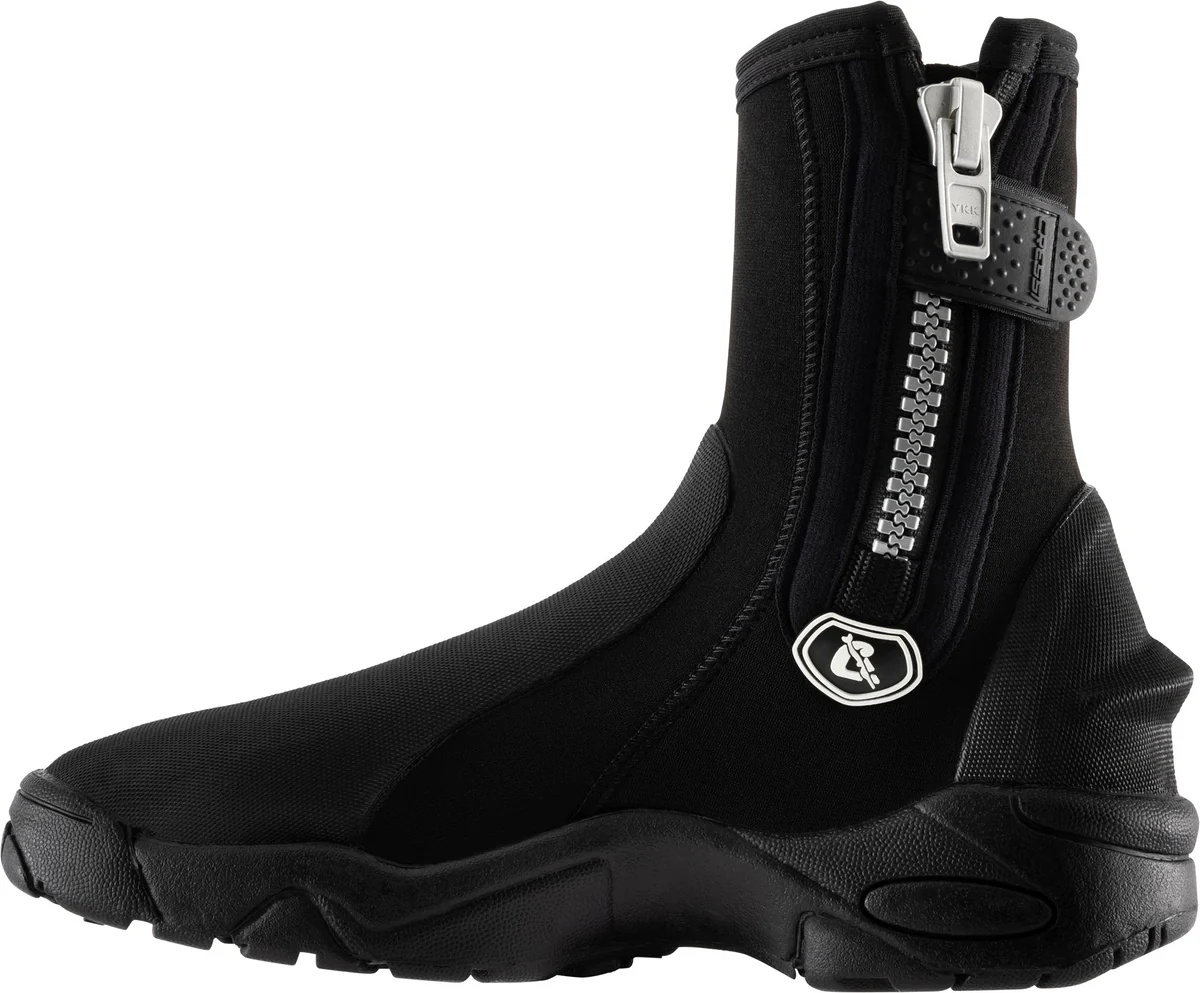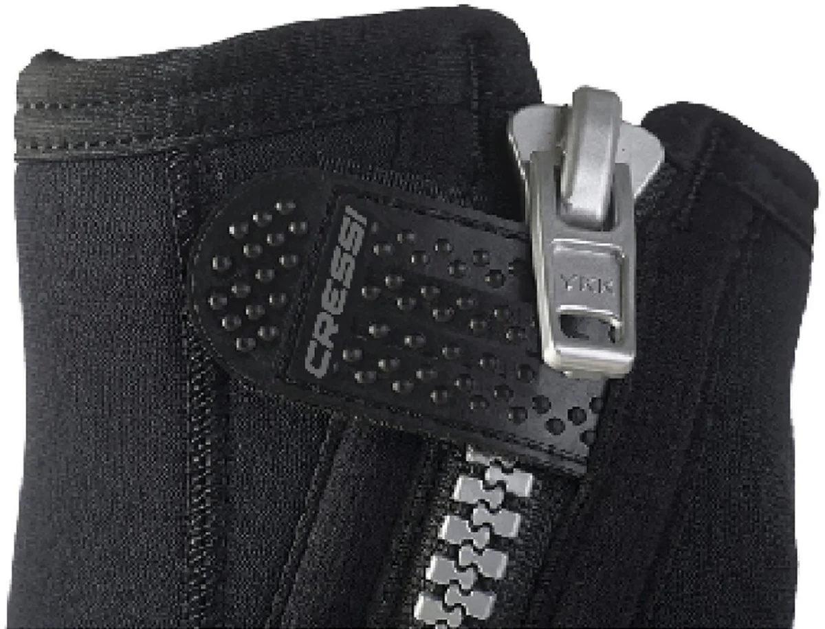 Cizmele de neopren Cressi Korsor Rigid Sole Boots 5mm L sunt robuste și confortabile, concepute pentru utilizarea cu labe cu călcâi deschis. Realizate din neopren moale din nylon de 5 mm, sunt ideale pentru apă rece. Degetul și călcâiul sunt întăriți cu protecție din poliuretan pentru durabilitate. La călcâi există o scobitură pentru fixarea curelei labei, iar fermoarul practic de la gleznă facilitează încălțarea și scoaterea. Clapeta sub fermoar minimizează pătrunderea apei, iar curelușa de la gleznă cu velcro asigură fixare sigură. Talpa rigida, antiderapantă și rezistentă acoperă întreaga suprafață a cizmei, protejând piciorul.