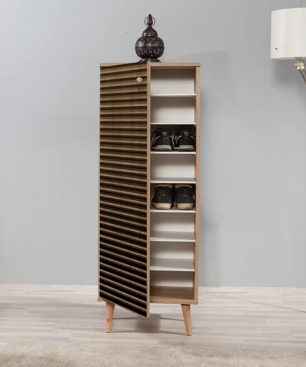 Realizat cu cea mai mare grijă și atenție la detalii, dulapul nostru de pantofi este fabricat din plăci aglomerate acoperite cu melamină 100%, asigurând durabilitate și longevitate. Grosimea de 18 mm adaugă robustețe, făcându-l o alegere de încredere pentru nevoile dvs. de depozitare a pantofilor. Dulapul stă drept pe picioare stabile, adăugând o notă de eleganță decorului casei dvs.