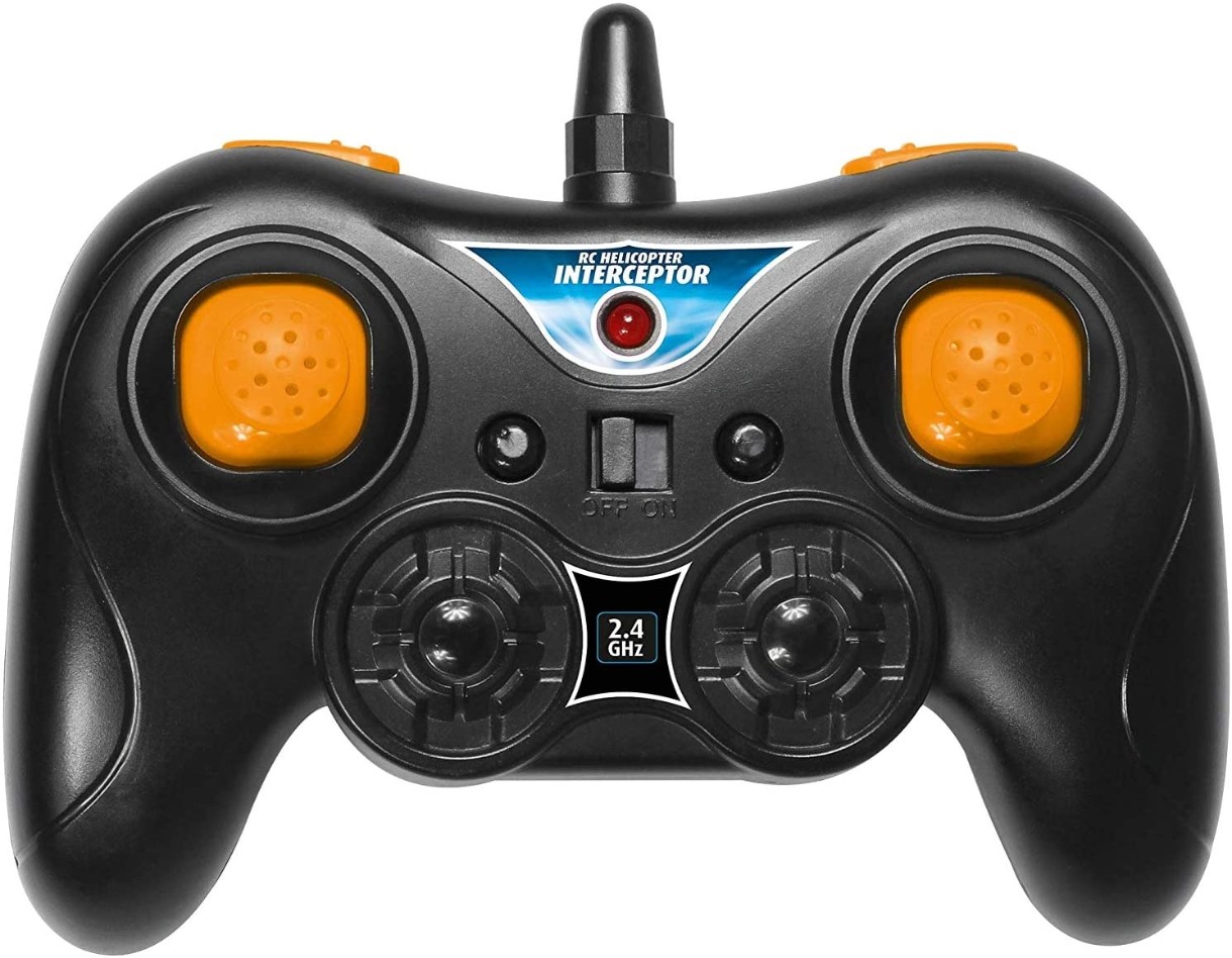 Datorita senzorului de evitare a coliziunilor, numarul de accidente cu interceptori de elicopter RC este redus semnificativ: daca senzorul cu infrarosu orientat inainte detecteaza un obstacol in timpul zborului inainte - de exemplu, un perete - elicopterul incetineste si se indeparteaza de obstacol. Telecomanda necesita 3 baterii AA 1,5V (nu sunt incluse).