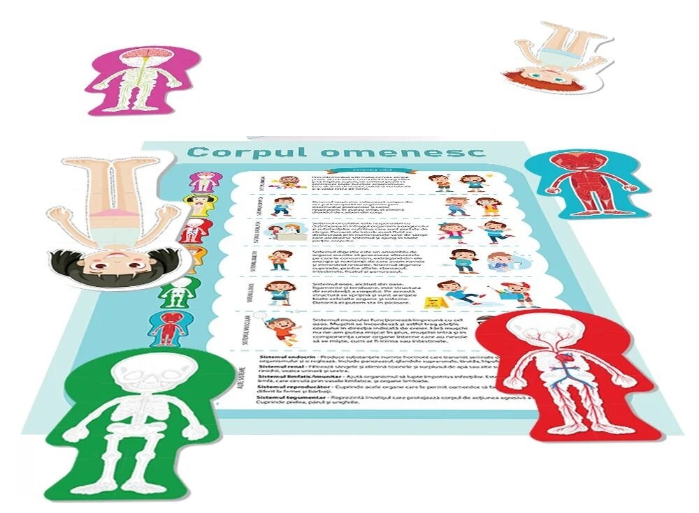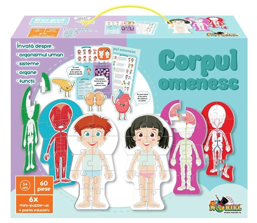 • 6 mini-puzzle-uri (fetita, baietel, sistemul osos, sistemul muscular, sistemul nervos, sistemul circulator) de cate 10 piese a 30 x 17 cm fiecare;