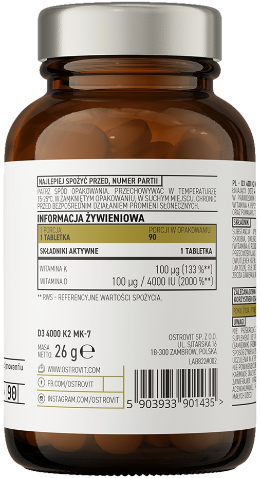 OstroVit Vitamina D3 4000 IU + K2 – supliment alimentar de înaltă calitate, care conține vitamina D3 și vitamina K2 sub formă de MK-7, forma cea mai bine absorbită de organismul uman. Produsul este disponibil sub formă de tablete ușor de înghițit și este destinat persoanelor care doresc să completeze dieta zilnică cu micronutrienți valoroși.