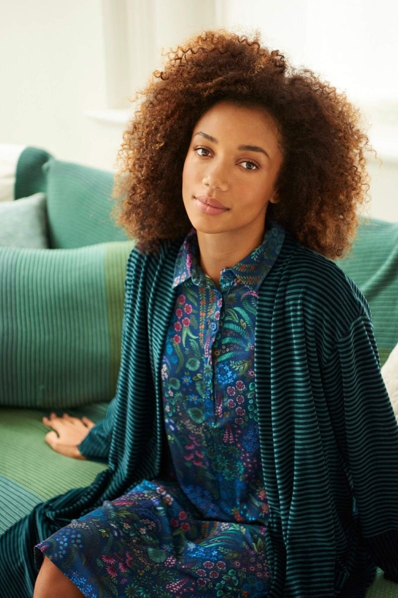 Cămașa de noapte cu mânecă lungă Daaltje Querida este un vis în care să dormi. Această cămașă de noapte elegantă cu mâneci lungi are un decolteu în V frumos și nasturi stilați. Designul Querida, cu ciorchinele sale rafinate de flori și frunze, strălucește subtil pe fundalul albastru profund. Fabricată din viscoză minunat de moale și elastică, această cămașă de noapte se simte ca o a doua piele.