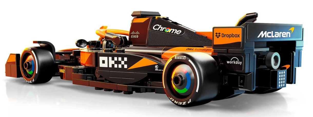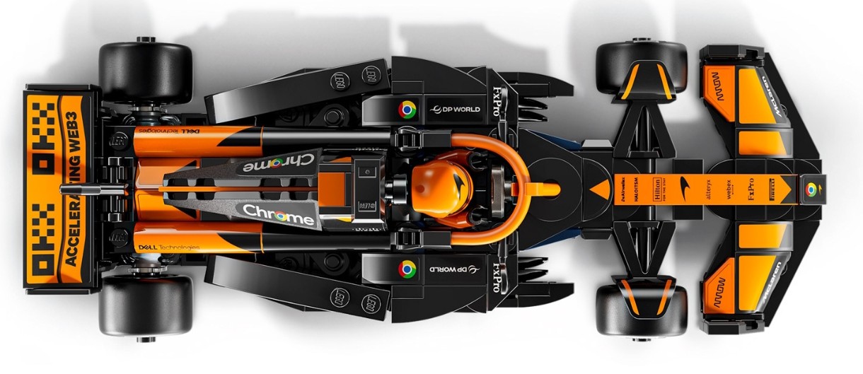 Mașina model F1 are un cockpit care se deschide atunci când grinda este ridicată, o suspensie cu aripă spate și braț transversal, autocolante cu sponsori și anvelope spate mai late cu inscripții Pirelli. Mașina de jucărie include, de asemenea, o minifigurină pilot în echipament McLaren și cască cu aripi, care poate fi plasată în cockpit pentru acțiune de curse.