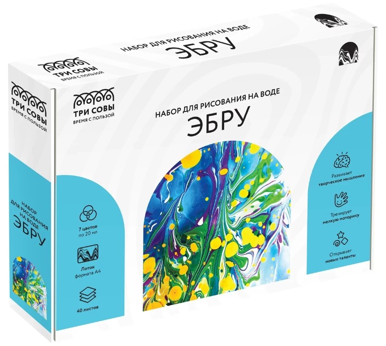 Set pentru pictură pe apă Trei Bufnițe „Culori Ebru”, 7 culori, A4, cutie din carton