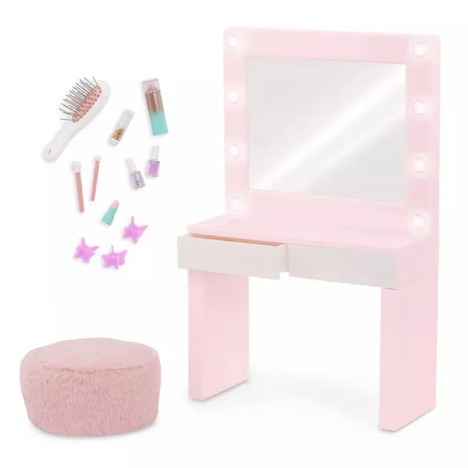 Aprindeți imaginația și imaginile fabuloase cu masa de toaletă Glam & Glow de la Our Generation pentru păpuși de 46 cm! Masa de toaletă vine într-o frumoasă culoare roz și are o oglindă strălucitoare care va face păpușile tale să se simtă ca o adevărată vedetă. Așează-ți păpușile pe puf pufos.