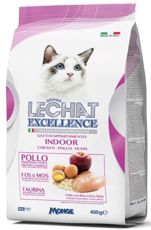 LECHAT EXCELLENCE INDOOR CHICKEN este o hrană completă pentru pisici domestice adulte, cu orez, ouă și mere. Le Chat Excellence este o linie de produse creată pentru a oferi doar ce e mai bun pisicilor dumneavoastră. Hrană completă pentru animale de companie, care conține ingrediente care asigură bunăstarea prietenilor noștri cu patru picioare în fiecare zi. Rețete cu materii prime furajere de înaltă calitate, cum ar fi ouăle, o sursă de proteine ușor digerabile cu valoare biologică crescută, și pulpa de mere, o sursă de fibre solubile pentru regularitatea fiziologică a tractului intestinal.
