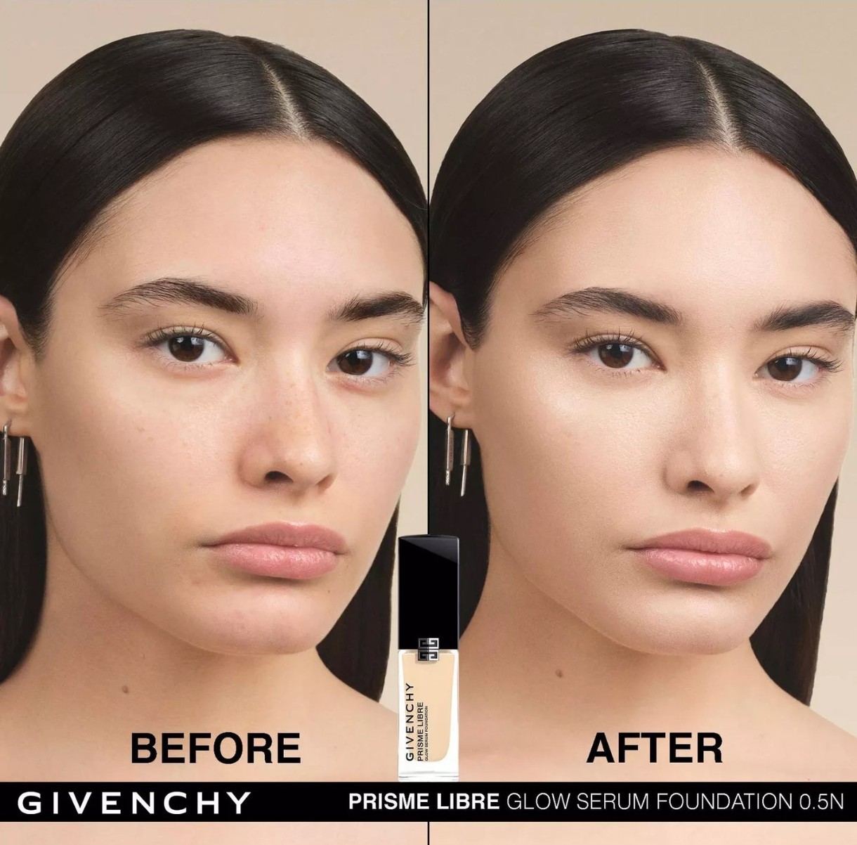 Fondul de ten-serum Givenchy Glow Serum Foundation, parte din colecția iconică Prisme Libre, creează o bază luminoasă cu efect de soft focus, care rezistă până la 24 de ore. Acest fluid lejer este potrivit pentru toate tipurile de piele și oferă o acoperire medie, ce poate fi intensificată după preferință.
