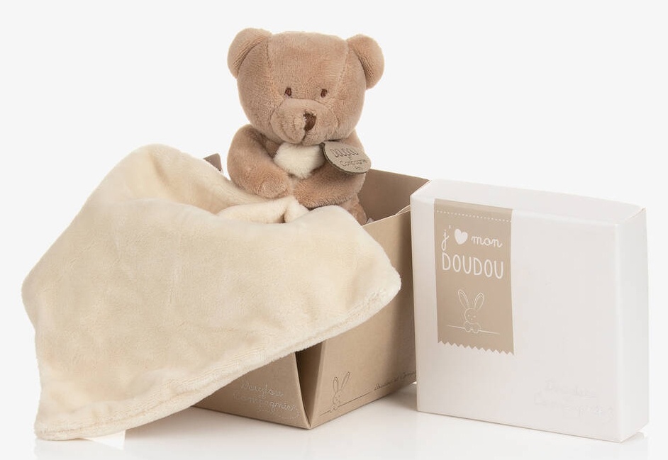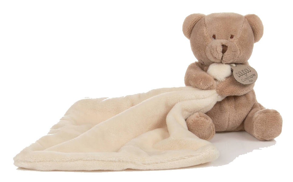 Jucărie de pluș bej și fildeș pentru bebeluși, băieți și fetițe, de la Doudou et Compagnie. Fabricată din velur super moale, are un ursuleț de pluș drăguț care ține o cârpă catifelată, ideală pentru mânuțele mici pentru a o prinde și explora.