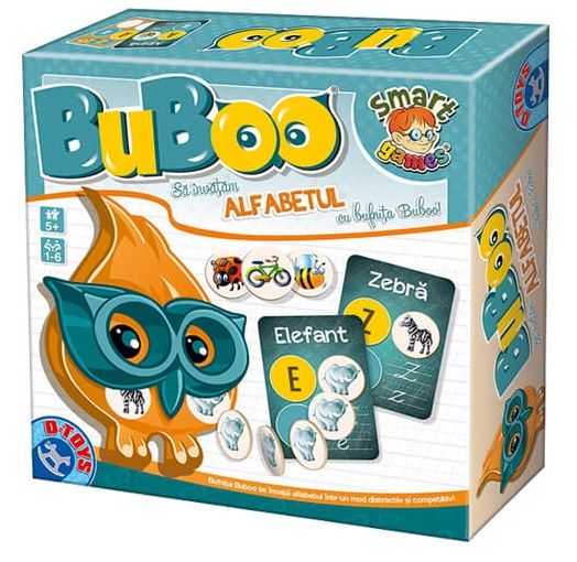 Acest joc face parte din seria jocurilor educative Buboo, cu ajutorul caruia copiii pot invata literele alfabetului intr-un mod distractiv si competitiv! Regulamentul include mai multe variante de joc pentru incepatori si jucatori avansati, fiind ideal atat pentru prescolari cat si pentru cei care vor sa exerseze alfabetul. Setul contine 56 jetoane de joc cu doua fete, 64 carti de joc cu doua fete si bufnita Buboo care distribuie jetoanele de joc printr-un mecanism special. Jocul dezvolta abilitatile lingvistice, gandirea asociativa, dexteritatea, agilitatea, logica si memoria. Se poate juca singur sau ca joc de societate dinamic (1-6 jucatori).