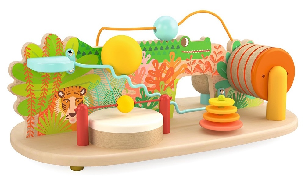 Jucăria Multi Sound este un set combinat cu activități acustice interesante, asigurând bucuria mișcării și a jocului în același timp. Descoperiți cum să produceți diferite sunete: Toc-toc - papagalul flexibil bate în cilindrul de lemn. Clac-clac - sunetul unei roți de învârtit. Tacka-tac-tacka - o minge care se rostogolește pe spatele crocodilului. Dring-dring - inelul cilindrului de învârtit. Ding - când mingea lovește cinelul. Dong - mingea de la capătul șnurului elastic de pe tamburină. Ding-ding-ding - mingea mare alunecă în canelura metalică. Tic-tic - ciocnitul cercurilor. Această masă acustică de activități din lemn ajută la dezvoltarea abilităților motorii ale copilului dumneavoastră și oferă o experiență de joacă sigură datorită picioarelor sale stabile și rezistente la impact.