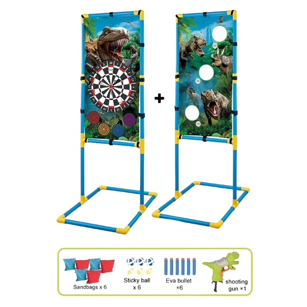 Set sportiv 2-în-1 „Țintă și aruncări” este un kit versatil pentru jocuri active, care combină darts și aruncarea săculeților. Acest set este un cadou perfect pentru copiii pasionați de jocuri dinamice și designuri viu colorate cu dinozauri.