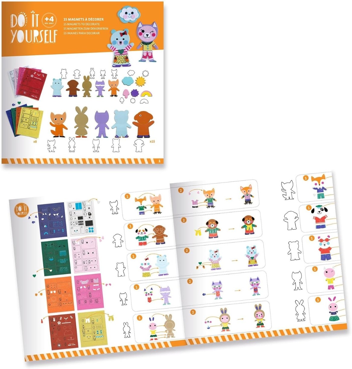 In set15 magneți din carton rezistent (5 mari și 10 mici), 8 seturi de autocolante ilustrate din fetru, instrucțiuni