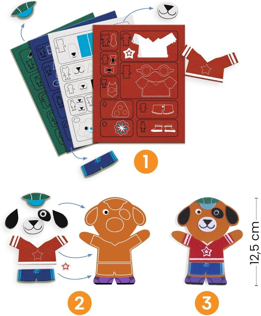 Seturile creative Djeco întăresc abilitățile motorii fine ale copilului, permițându-i să decoreze 15 animale diferite cu autocolantele din fetru incluse.