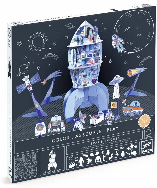 Setul Djeco Space Rocket le oferă copiilor o aventură creativă între culori și construcții 3D. Copiii își pot colora racheta după imaginație și apoi o pot asambla împreună cu accesorii și detalii care dau viață universului lor spațial.