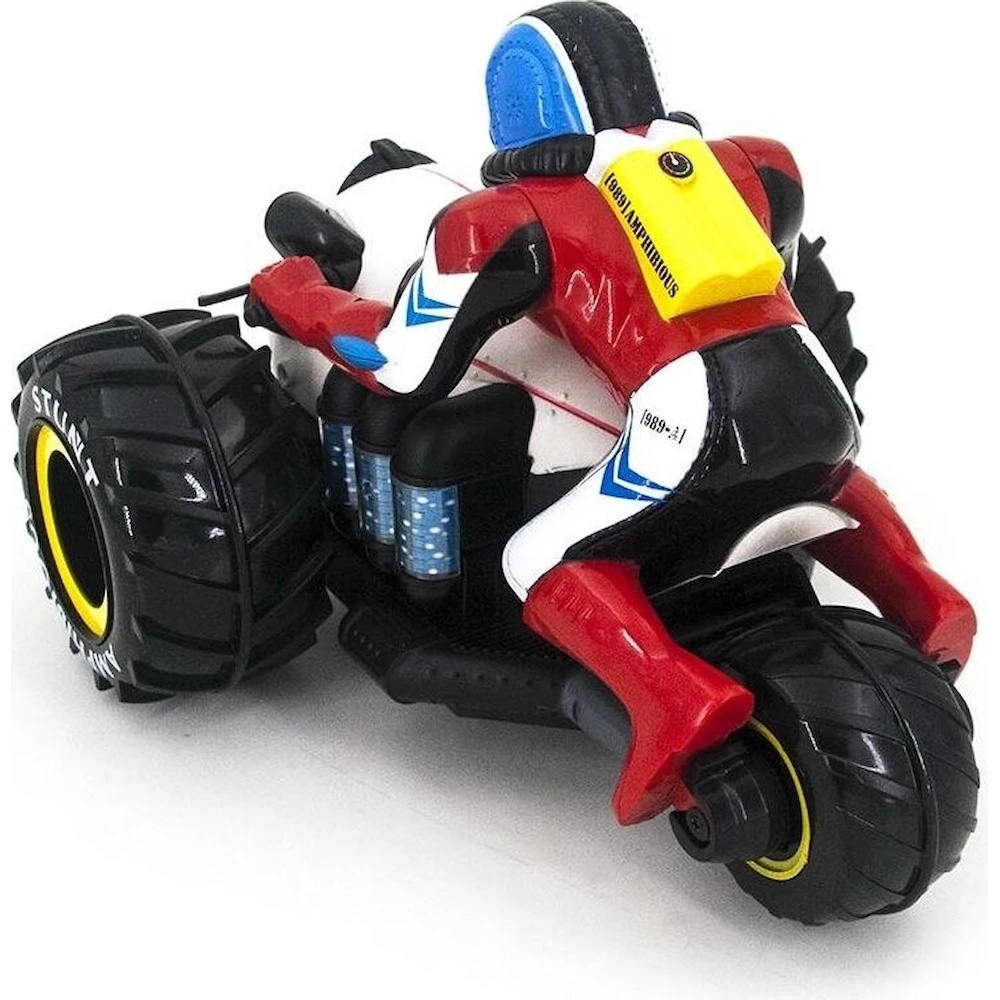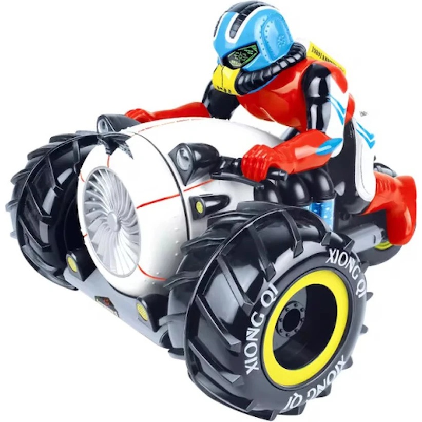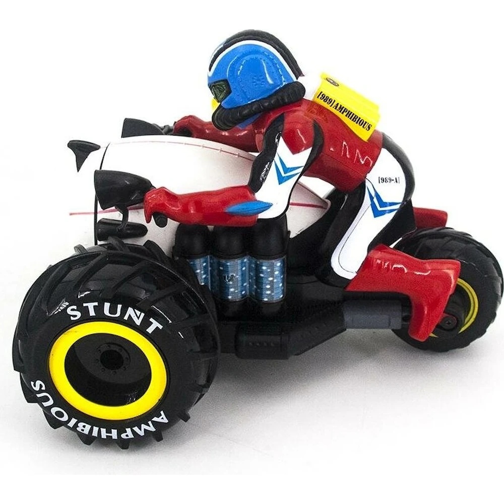 Motocicleta radiocomandată 2 în 1 amfibie și răsturnabilă este un model unic, care combină funcțiile de motocicletă, vehicul amfibiu și mașină de tip flip.