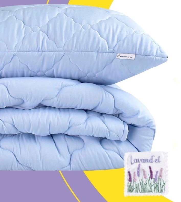 Setul de pat Lavander include o plapumă, o pernă și o pungă cu ierburi parfumate. Husele sunt din microfibră, iar umplutura este din material poliester siliconizat.